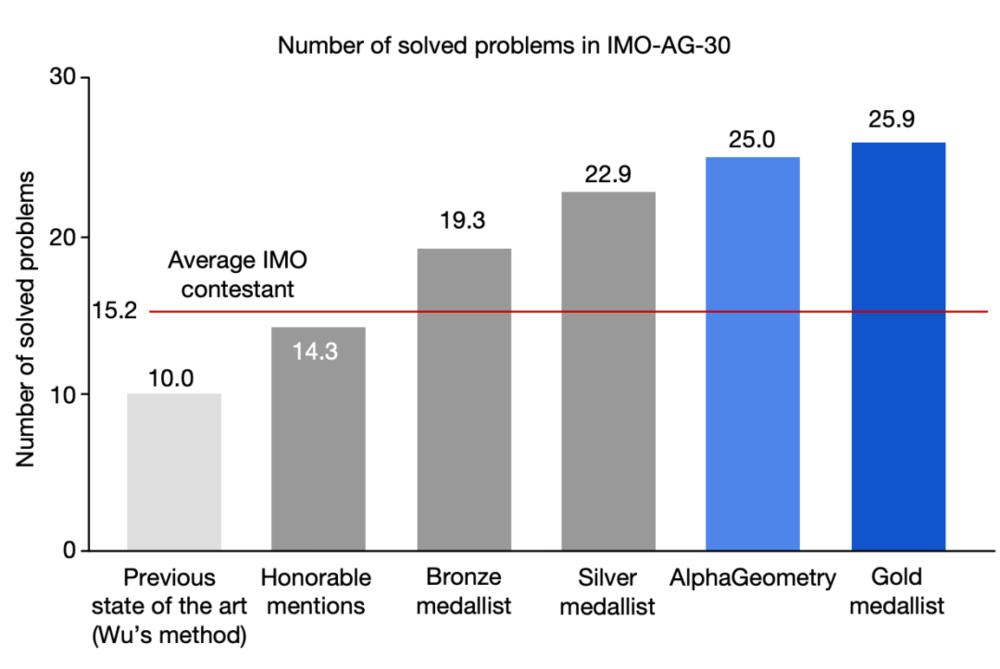 据介绍,AlphaGeometry 通过自主合成数百万个定理和证明,解决了 30 个最新奥林匹克级别(优等高中生参加的数学定理证明大赛)问题中的 25 个,接近国际数学奥林匹克竞赛金牌选手的平均表现,远超之前最好的自动化定理证明系统。