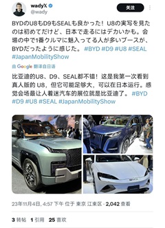有日本网友表示,整场车展最迷人的就是比亚迪展台了,U8、D9 和海豹都非常不错~