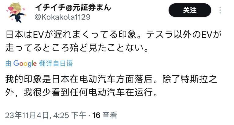 甚至有日本网友吐槽,日本在电动车方面已经落后,街上除了特斯拉很少看到其他品牌电动车。