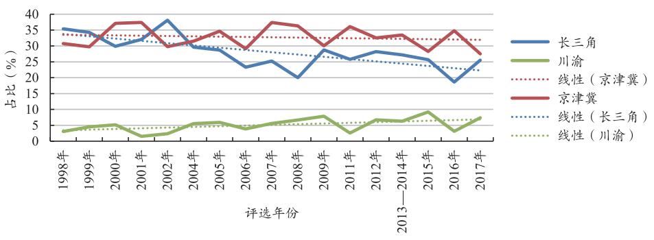 长三角地区、京津冀地区、川渝地区高层次人才数量全国占比历年变化 / 东部地区高层次人才占比逐渐下降,而西部地区占比逐渐增加