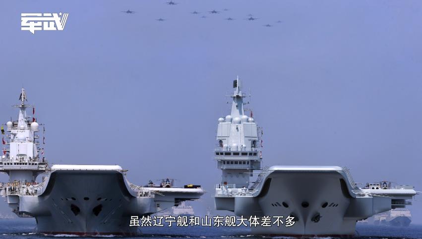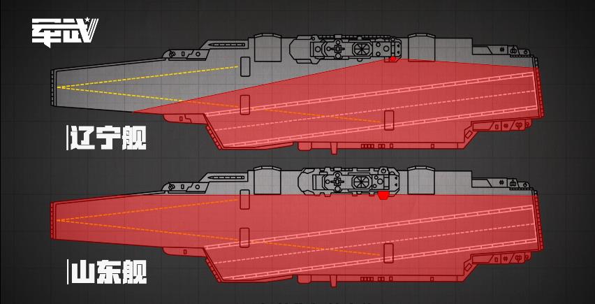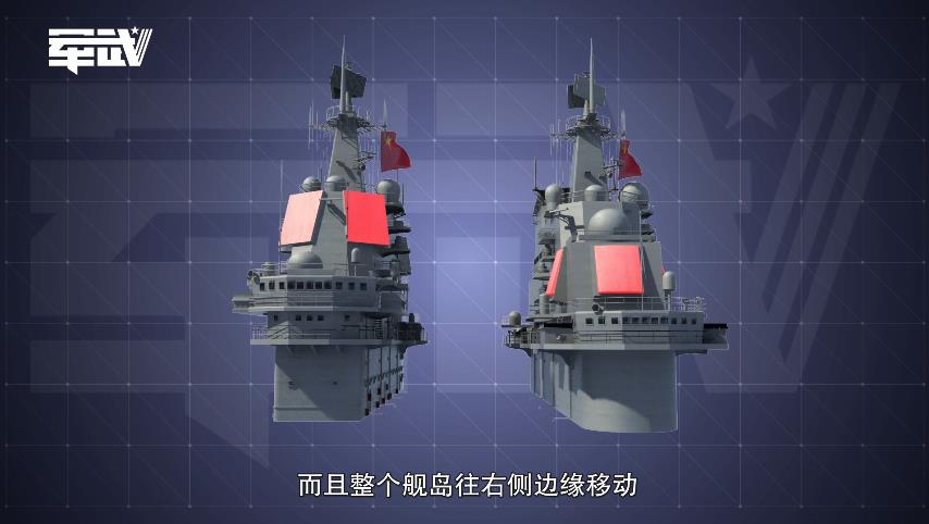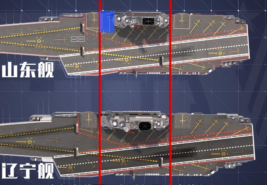 那从外形看呢,虽然辽宁舰和山东舰大体差不多,但在很多至关重要的细节上,山东舰都做了非常明显的改进。首先第一点:舰岛。山东舰相比辽宁舰,它的舰岛做了很大改进。首先是体积缩小了,你舰岛越大,就越影响飞机起降。你看印度那艘航母,舰岛几乎占到了甲板中部,对舰载机的降落影响非常大。而山东舰的舰岛相比辽宁舰,长度缩短了好几米,舰岛的雷达安装方式也和辽宁舰不同,高度更高。而且整个舰岛往右侧边缘移动,取消了辽宁舰的人行通道。