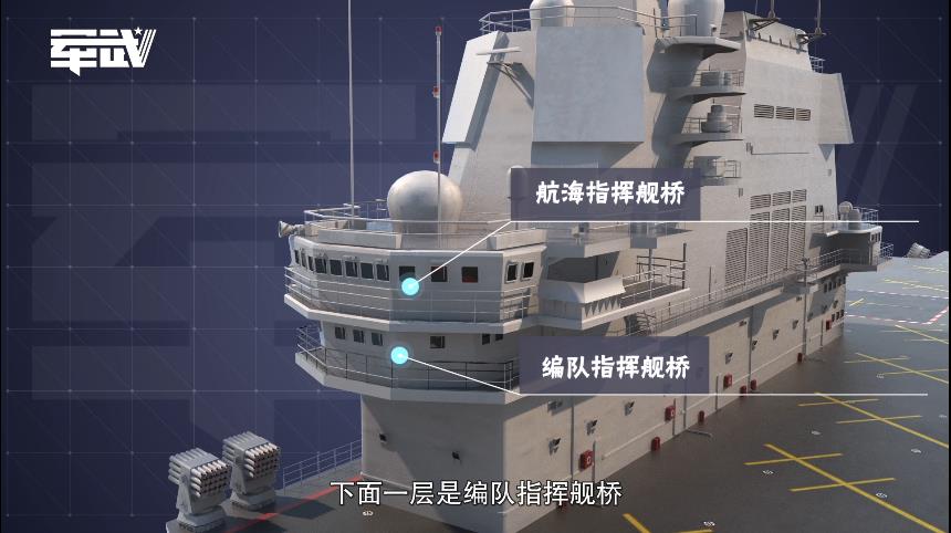 其次呢,是舰岛后面的航空指挥舰桥,那辽宁舰因为先天设计不足,它的航空舰桥是继承了原来的基辅级航母,像个宝石一样,我之前亲自去基辅号的航空舰桥看过,它里面只有一个指挥位,视野非常狭小。因为基辅级航母用的是垂直起降的雅克38,它的航空舰桥观察视野只能看到到左舷甲板的情况。而我们之后在辽宁舰的使用中发现了这个问题:在指挥舰载机起飞时,空间有限的航空舰桥很难观察前部甲板的情况。所以在山东舰上就改进了航空舰桥的设计,扩大了它的内部空间,位置更加突出,可以更好的指挥航空作业。
