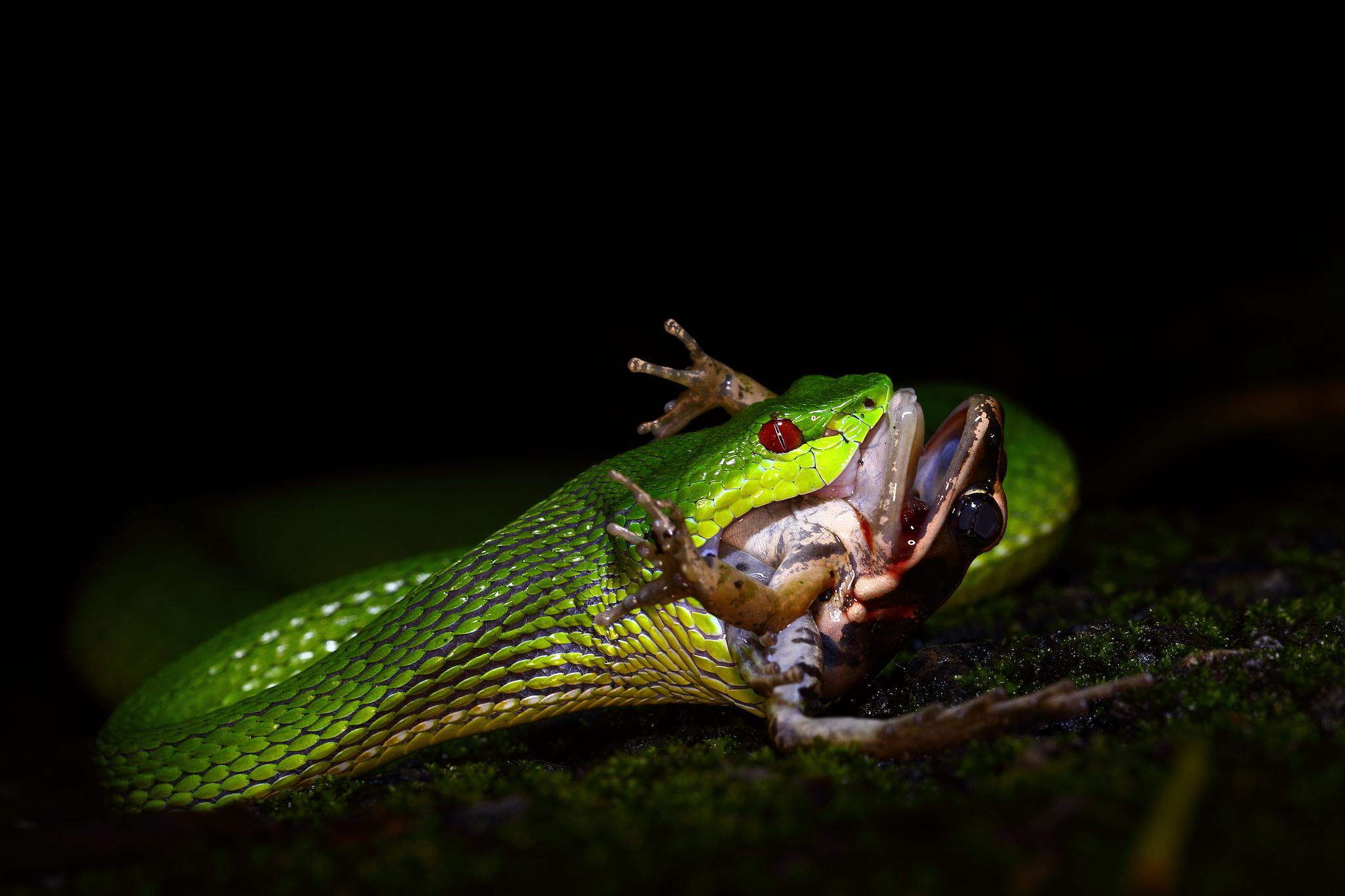 竹叶青是夜行蛇类,一般在晚上捕食,它们通常吃蛙、蝌蚪、蜥蜴、鸟及小型兽类,这种蛇的耐饿能力极强,可以超过5个月不吃东西但仍然身体健康。它们还有一定的趋光性,喜欢往有火光的地方跑,不过对电灯这些倒是没有多大的反应。