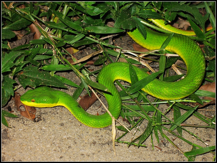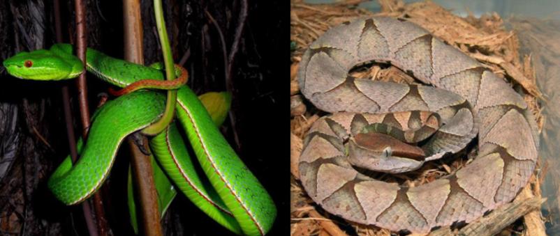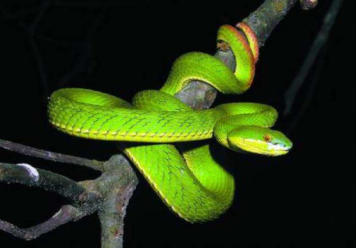 竹叶青是我国常见的毒蛇之一,又叫作青竹蛇、焦尾巴、赤尾青等。这种蛇一般都是浑身翠绿色的,头部呈三角形,尾部有部分红色,很好认。竹叶青主要分布在我国的南部,比如广东、广西、浙江、四川、云南等地,它们喜欢生活在山区树林中或阴湿的山溪旁杂草丛、竹林中,这些地方可以完美的隐藏竹叶青的身影,帮助它们更好的捕食。