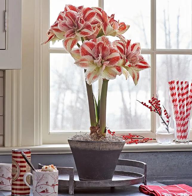 朱顶红花枝亭亭玉立,4~6朵朱红色喇叭形花朵着生顶端,朝阳开放,显得格外艳丽悦目。因朱顶红的外形很像君子兰,也有"君子红"的美称。