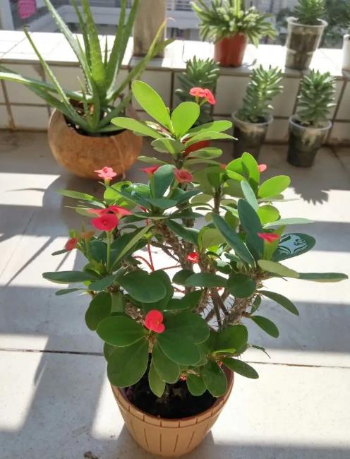 虎刺梅的花果期是全年,花朵很好看,是那种比较美丽的大红色,带有一点点玫红色的感觉。虎刺梅的花朵质感和山茶花类似,摸上去感觉会有一点点硬。