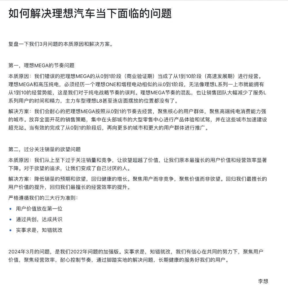3 月 21 日,理想汽车 CEO 李想发布全员信,李想反思了自 3 月初理想 MEGA 上市以来遇到的一系列问题。