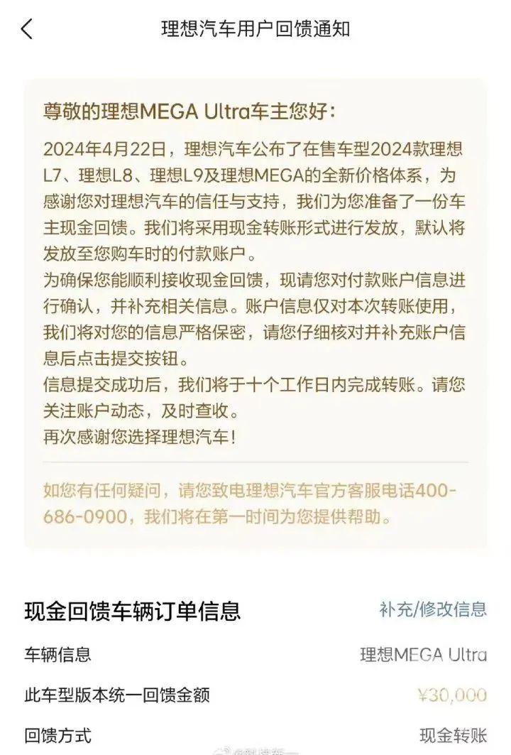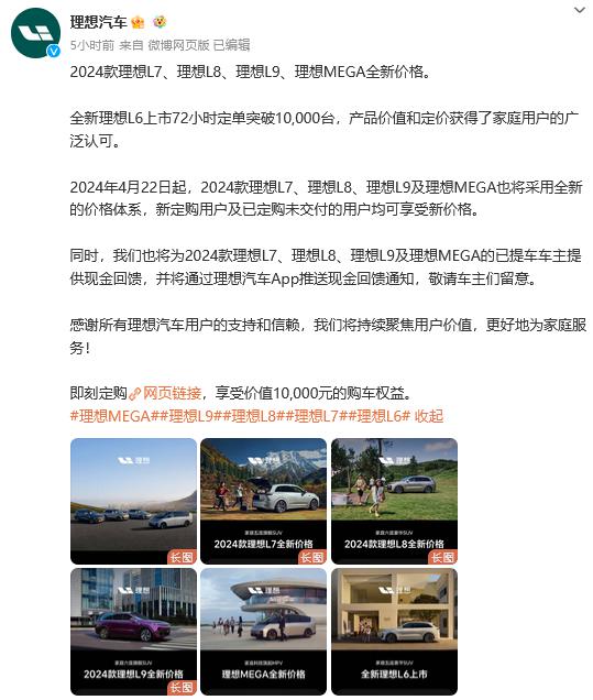 22 日早上,理想汽车官方公布了全线产品降价消息。同时,理想汽车还宣布将为 2024 款理想 L7、理想 L8、理想 L9 及理想 MEGA 的已提车车主提供现金回馈。