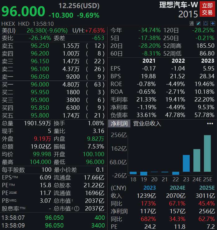 4 月 22 日,理想汽车(02015.HK)开盘跌 5.93%,截至下午发稿报 96 港元 / 股,总市值 2037 亿港元。