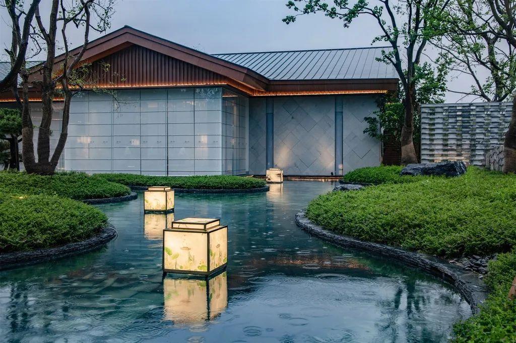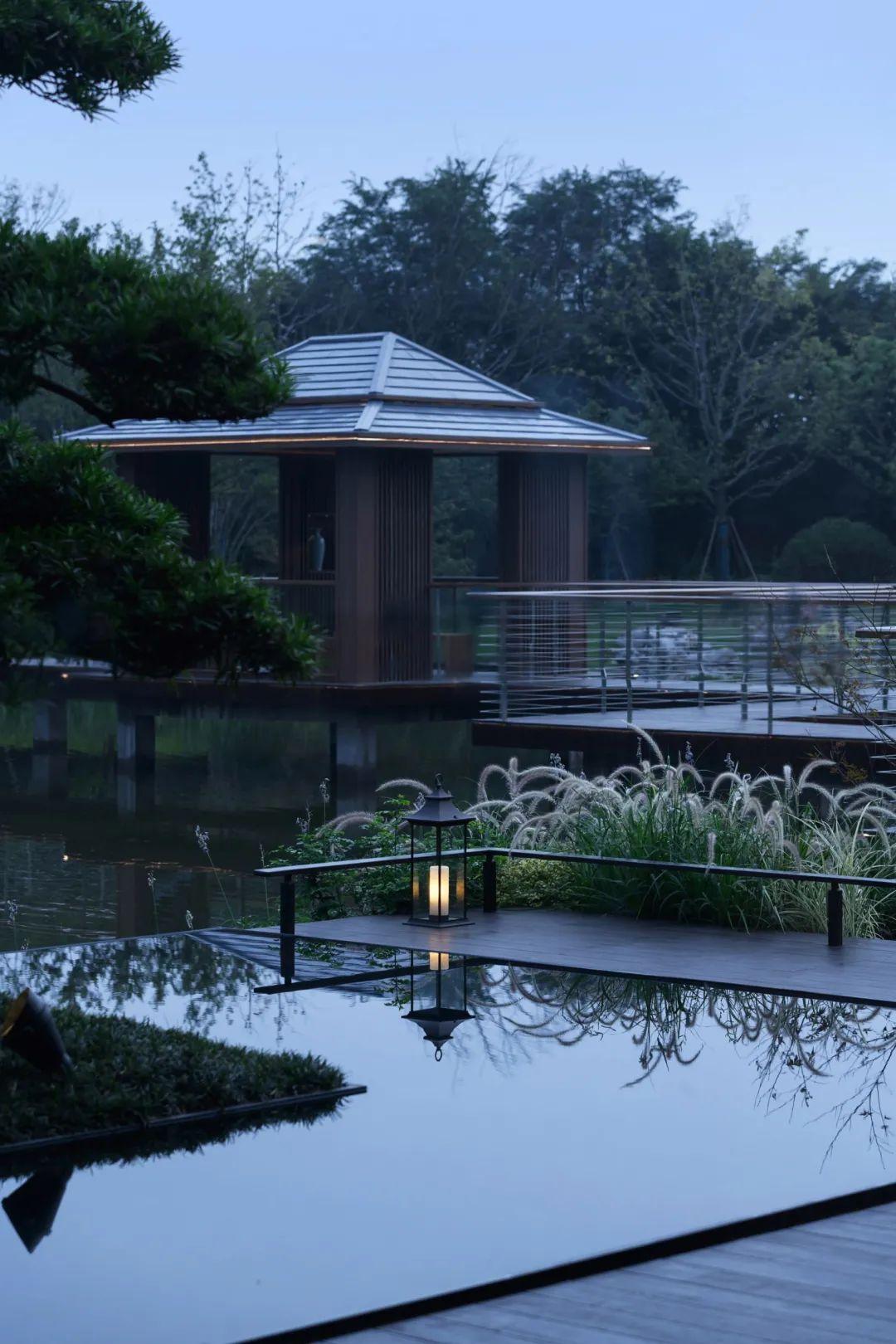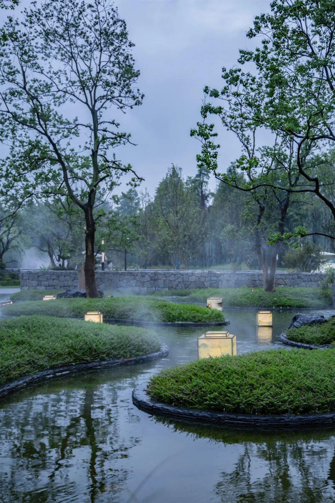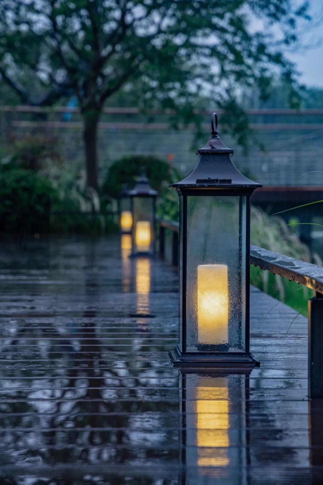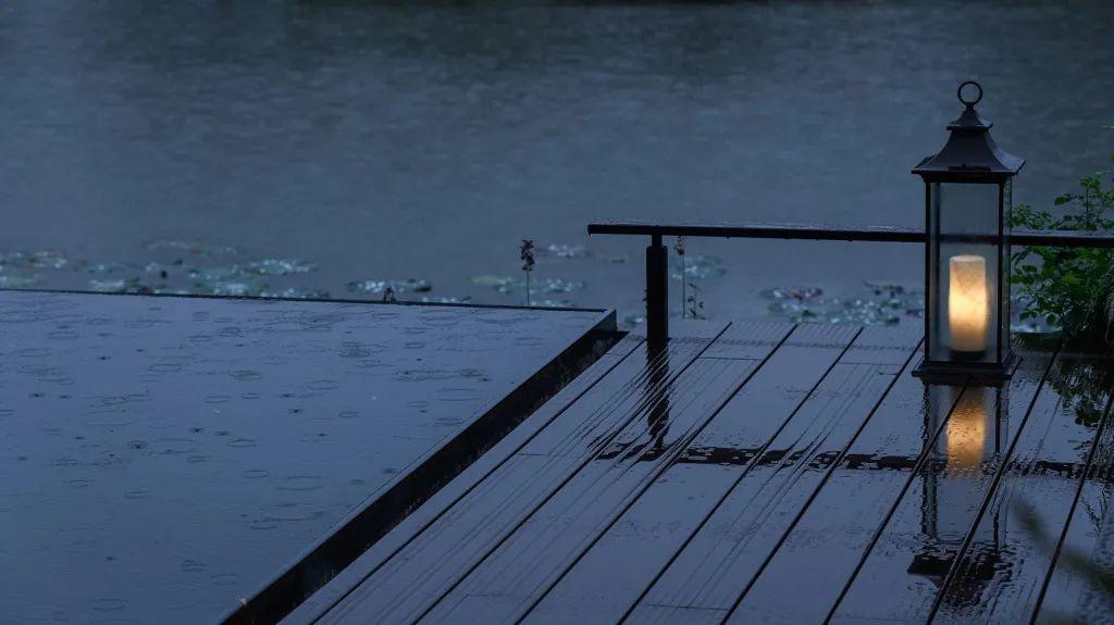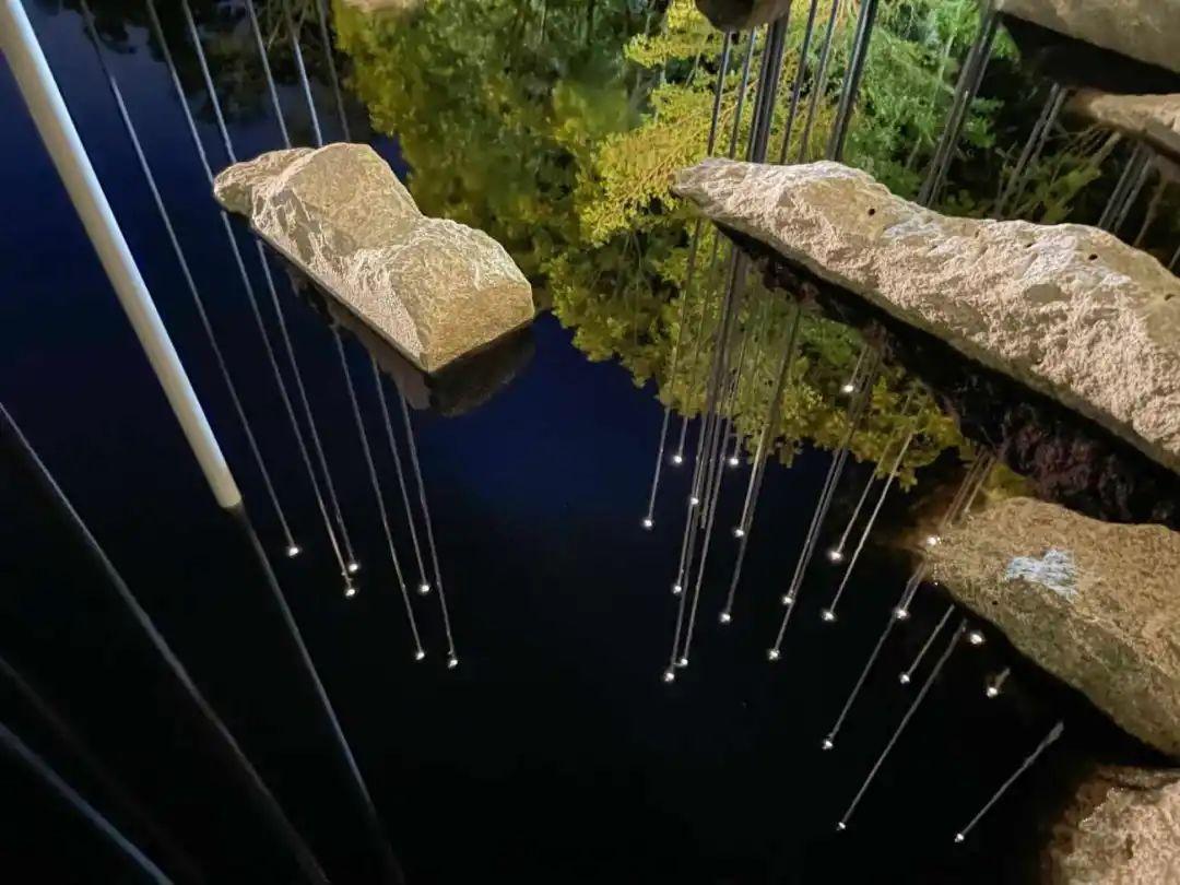 墨青色微微晕染,池底板岩自然堆叠的倒影。偶尔,小雨落下,伴随着摇曳的灯光在水面上荡漾。