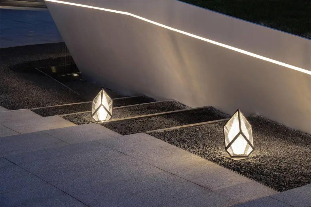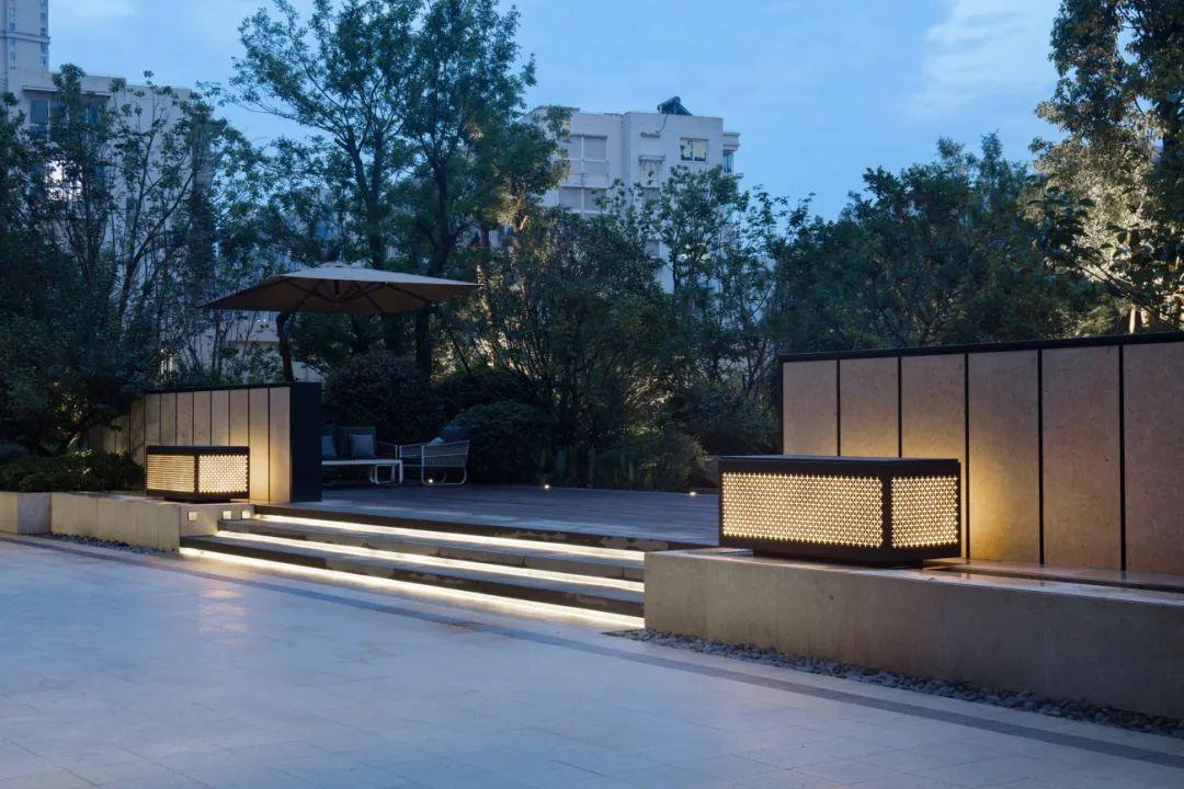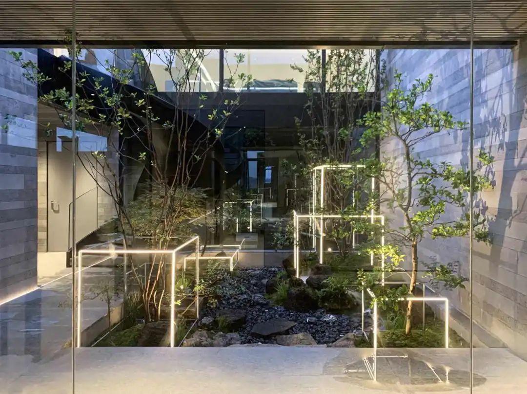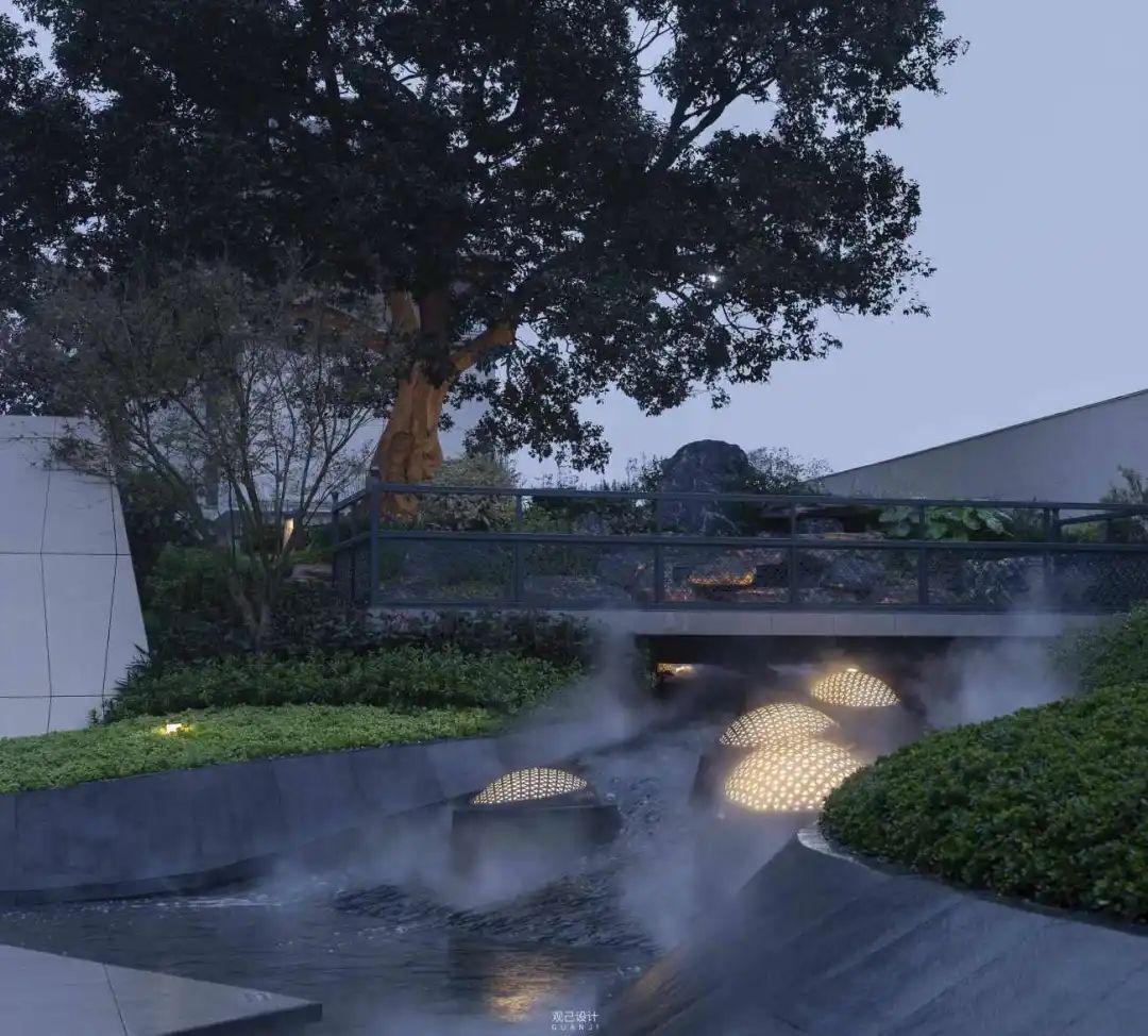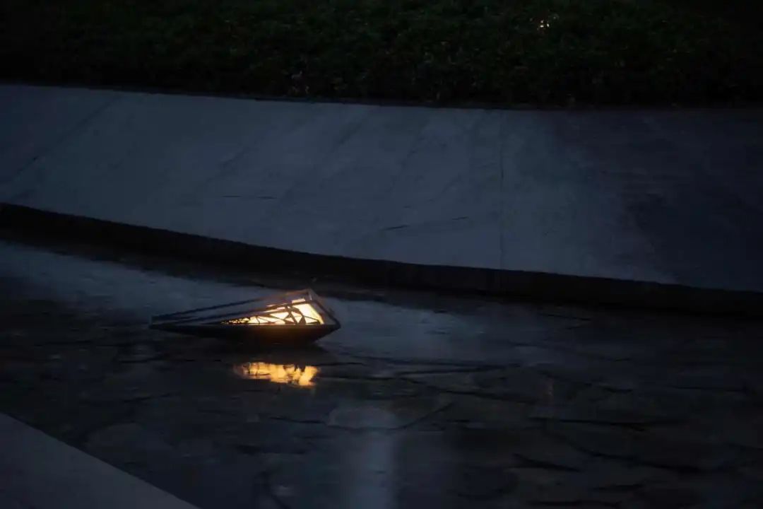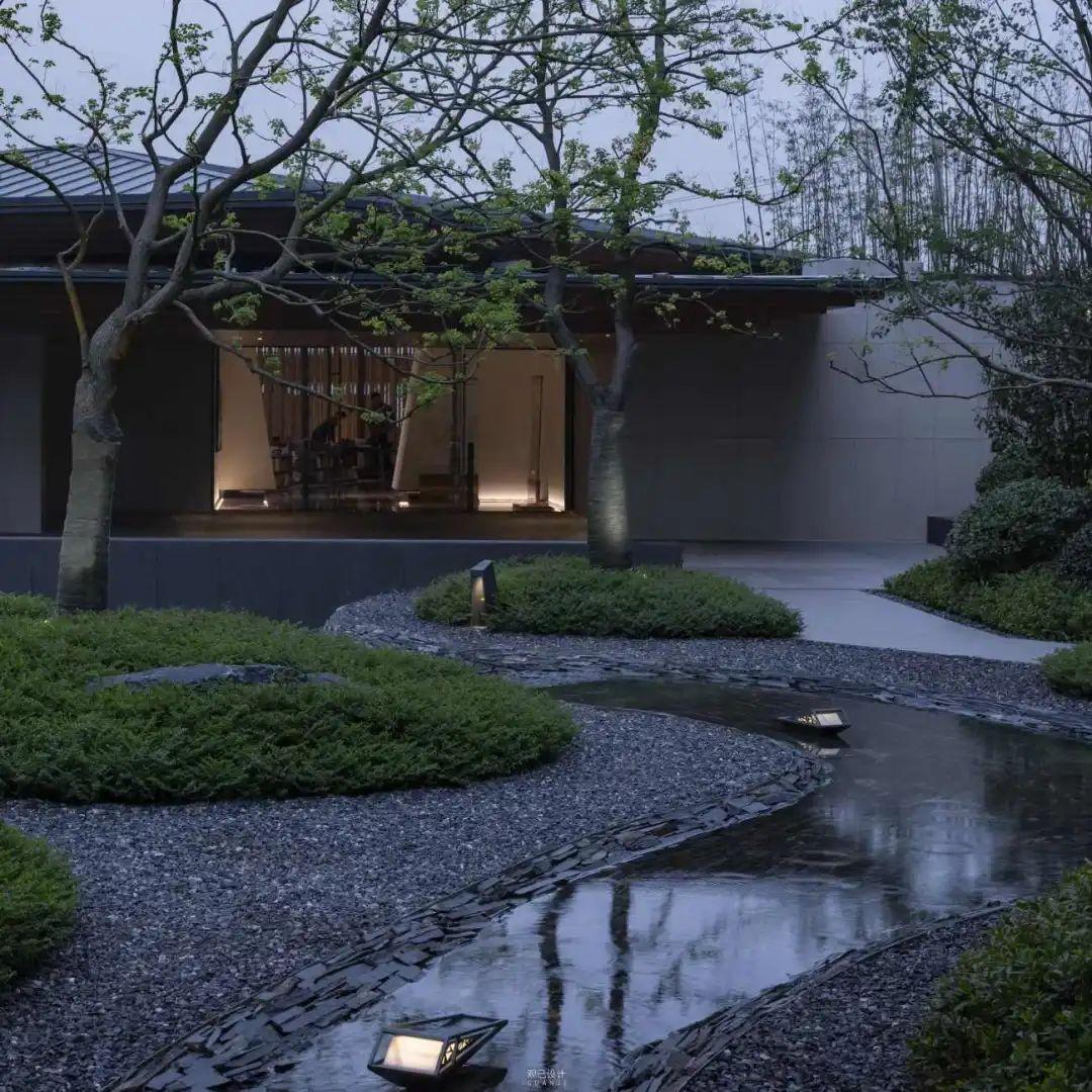 墨青色微微晕染,池底板岩自然堆叠的倒影。偶尔,小雨落下,伴随着摇曳的灯光在水面上荡漾。
