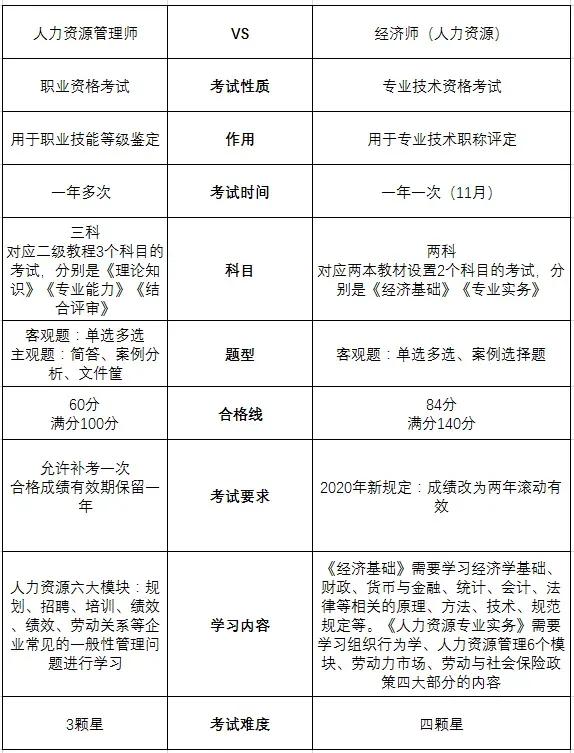 经济基础考试包括经济学基础、财政、货币与金融、统计、会计、法律等相关的原理、方法、技术、规范规定等,人力资源专业实务考试包括组织行为学、人力资源管理6个模块、劳动力市场、劳动与社会保险政策四大部分的内容,相比较之下,经济师比人力资源管理师考试难度大。