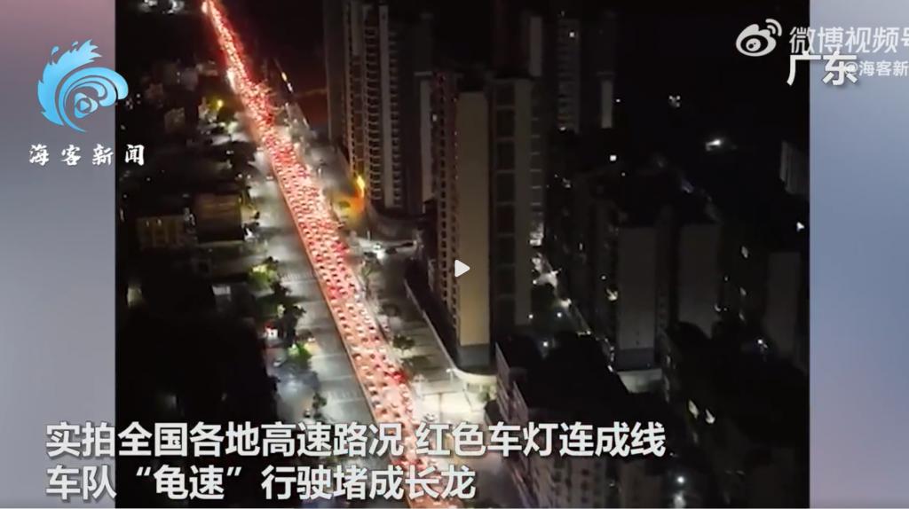 据海客新闻官方微博,10 月 4 日,中秋国庆假期进入第 6 天,多地陆续迎来返程高峰。实拍全国各地高速路况,红色车灯连成线,车队 " 龟速 " 行驶堵成长龙。有网友晒出高速路况画面表示 "特意提前三天回去,没想到又堵路上了。"、"带回的特产都要在路上吃完了"。