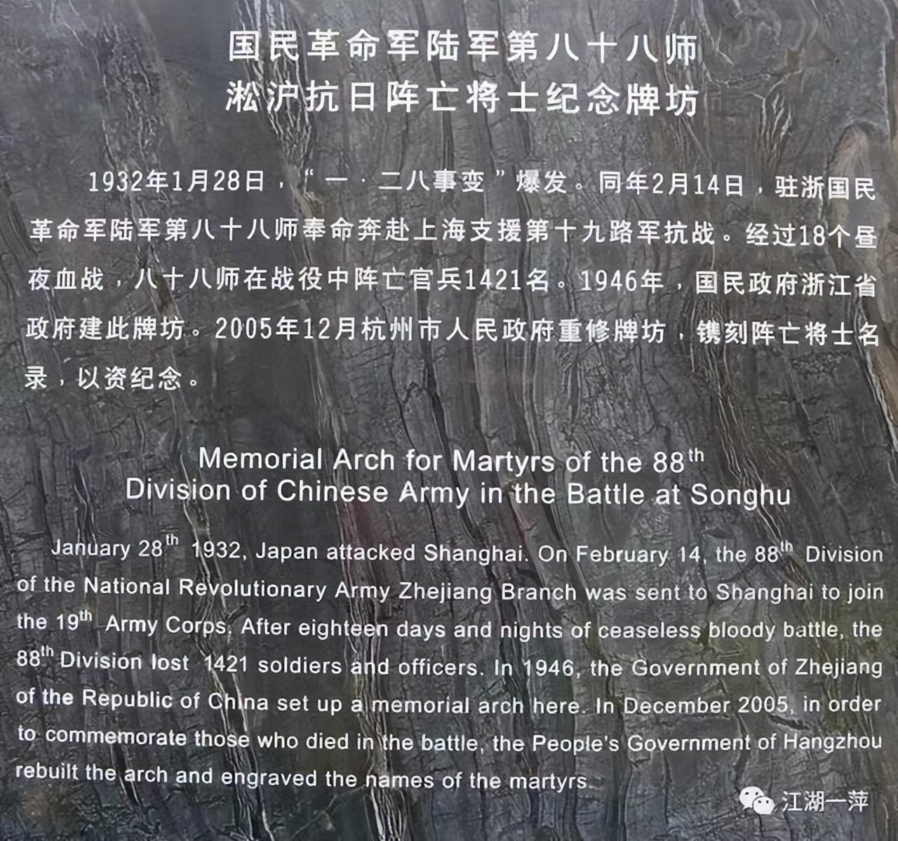 树立于杭州市西溪路73号的国军88师淞沪抗日阵亡将士纪念碑