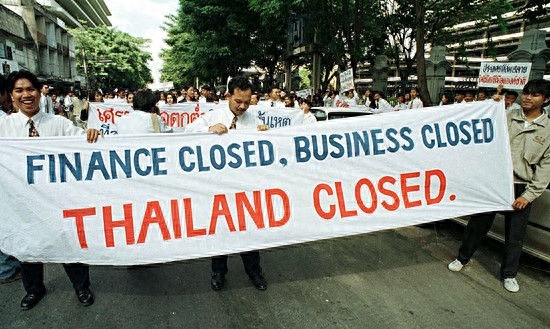 在随后的时间内,金融危机率先在泰国爆发,美元汇率上调导致泰铢剧烈贬值,企业亏损严重,无力偿还外债,进而产生连锁反应导致国内的外资疯狂溃逃,泰国的房地产泡沫率先炸开。