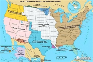 下图就是美国从1783年至1917年间,从其他各国处弄来的领土,黑色文字部分有具体的年份和国家: