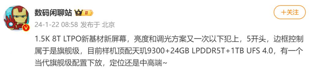 1 月 22 日,知名博主 @数码闲聊站在微博上透露了疑似Redmi K70 Ultra的配置信息。据他表示,这款新手机将配备一块 1.5K 8T LTPO 新型材料屏幕,峰值亮度超过 5000 尼特,边框设计达到了旗舰级水平。目前样机搭载了天玑 9300 处理器,最高配置为 24GB LPDDR5T 内存 +1TB UFS 4.0 储存。此外,新机还将配备一些旗舰级别的功能,定位于中高端市场。
