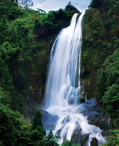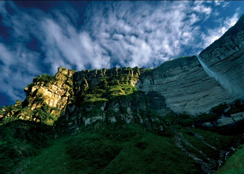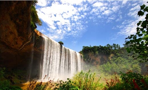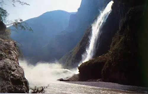 位于巫溪大宁河庙峡河谷之中。瀑布从西岸峻茂的峭崖间从天而降,宛如一条矫健的白龙,撞石飞越宽近百米的大宁河,汹涌壮阔,七彩斑斓,蔚为壮观,形成“飞瀑峡中过,舟从瀑下行”的天下奇观。