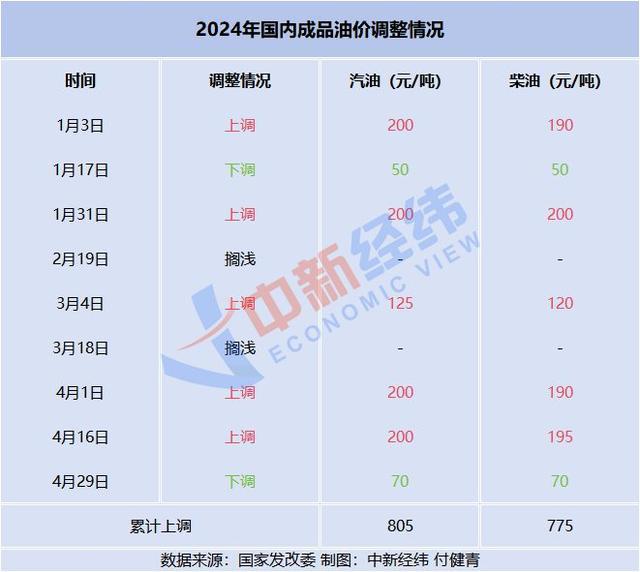 刘炳娟表示,今年以来,国内油价已经历九轮调整,分别为 " 五涨两跌两搁浅 "。涨跌互抵后,国内汽、柴油价格每吨较去年底分别提高 805 元、775 元。据测算,本轮调价过后,2024 年成品油调价将呈现 " 五涨三跌两搁浅 " 的格局。