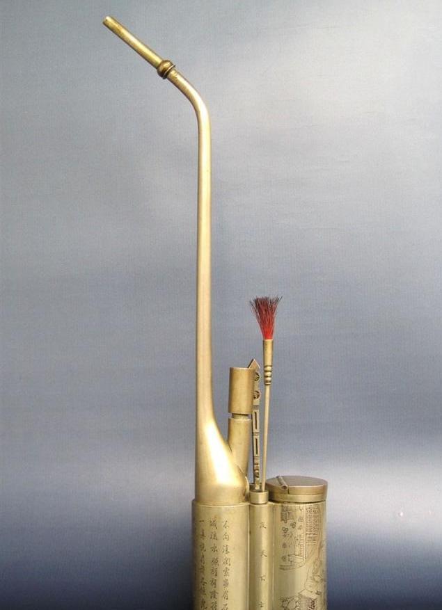 烟筒后方,有一带折褶盖盛烟丝的铜盒,烟筒两旁,各有一只铜槽套管,一边放烟镊子夹烟烬,一头装有一个小棕刷子,掸烟屑的烟签子,另一边是插点烟用火纸捻儿(又叫“火纸媒子”),是抽水烟袋必不可少的引火媒介。纸媒子的原料是裱心纸,先把纸裁成寸把宽的长条,然后搓成媒子,要诀是松紧适度,才能一吹即燃。小孩子学吹火纸媒子,一不小心烧了上嘴唇,那是常有的事。