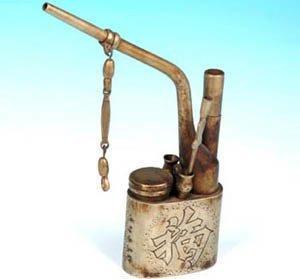 当年南北各省,虽然都流行抽水烟袋,可是水烟袋的款式大小、长短曲直,以暨雕文镂花,技巧各异,南装北式一望而知。京式的水烟袋,都是云白铜打造,讲究大方厚重,烟管稍长,弯度不大,连系筒管的地方,多半采用丝绳,或是丝线编织的璎珞绦子。那种丝络悉出闺中女儿,巧手新裁,争奇斗胜,盛饰增丽,甚至有珠翠玛瑙穿成链子的,彩错丝帉,那就更增美观,抬高水烟袋的身价了。