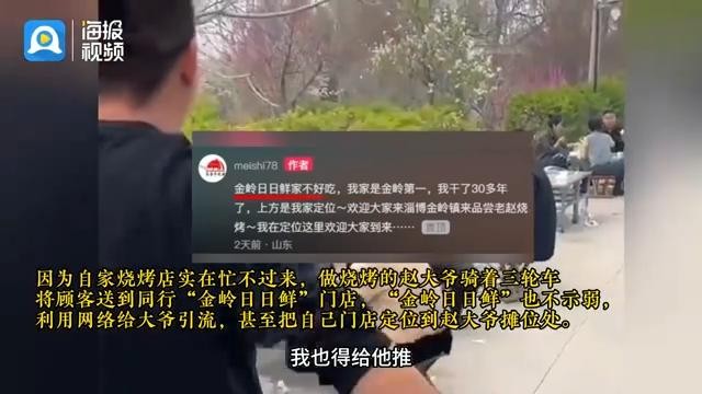 起因赵大爷烧烤店实在忙不过来,哪怕是他儿子都已经回来帮忙了还是不行,于是做烧烤的赵大爷骑着三轮车将顾客送到同行“金岭日日鲜”门店,未曾想在这个自媒体发达是时代硬生生的又将两人送上热搜。有记者甚至驱车抵达位于淄博市临淄区金岭镇的两家烧烤店,探访两家的现状。