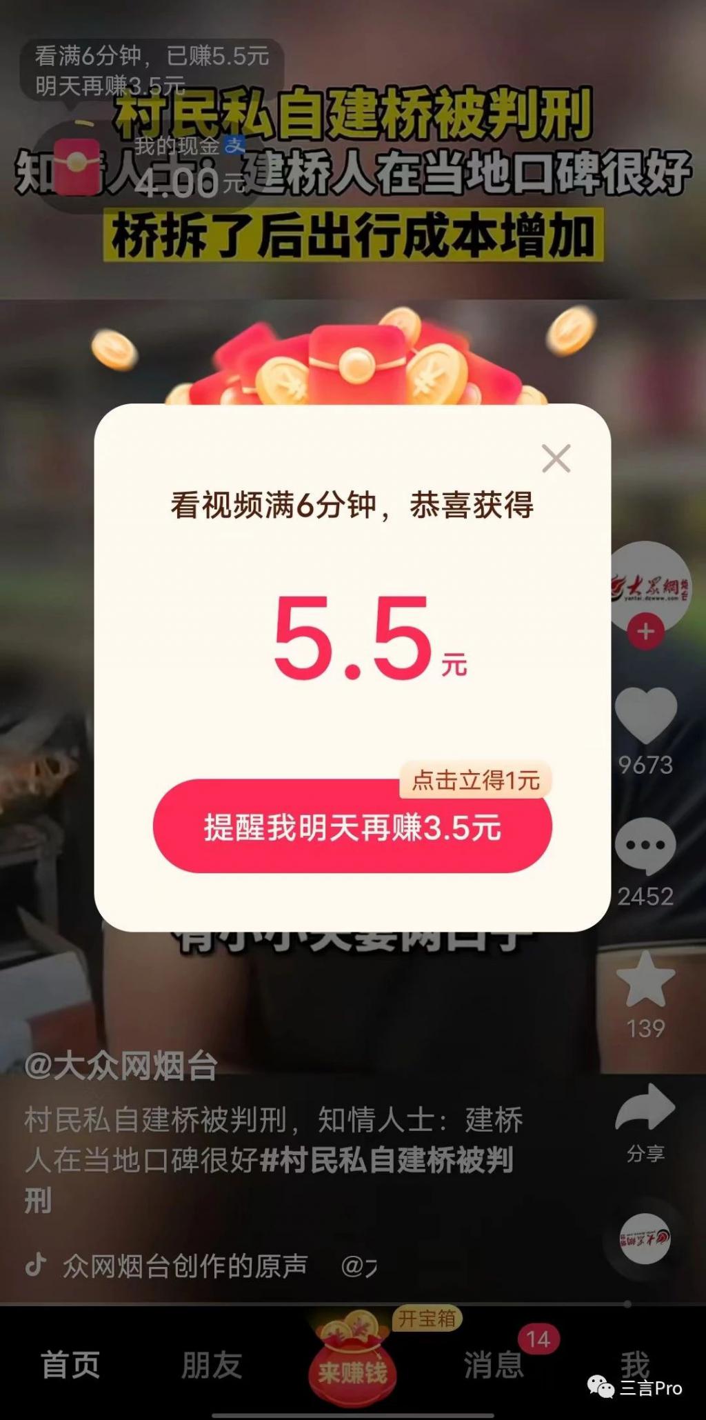 页面显示,观看视频满 6 分钟,获得 5.5 元奖励。