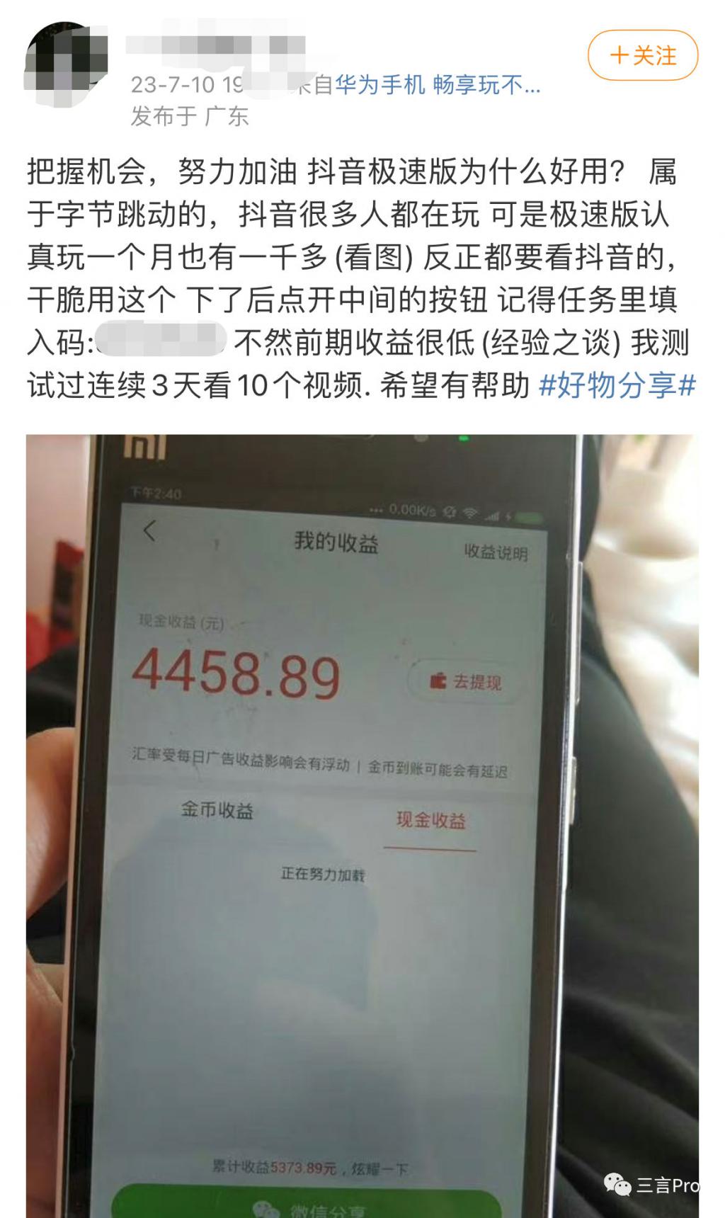 还有一位网友比较猛,他表示认真玩抖音极速版一个月可以赚一千多,还分享了一个邀请码。笔者猜测,他的玩法是赚邀请新用户的奖励。