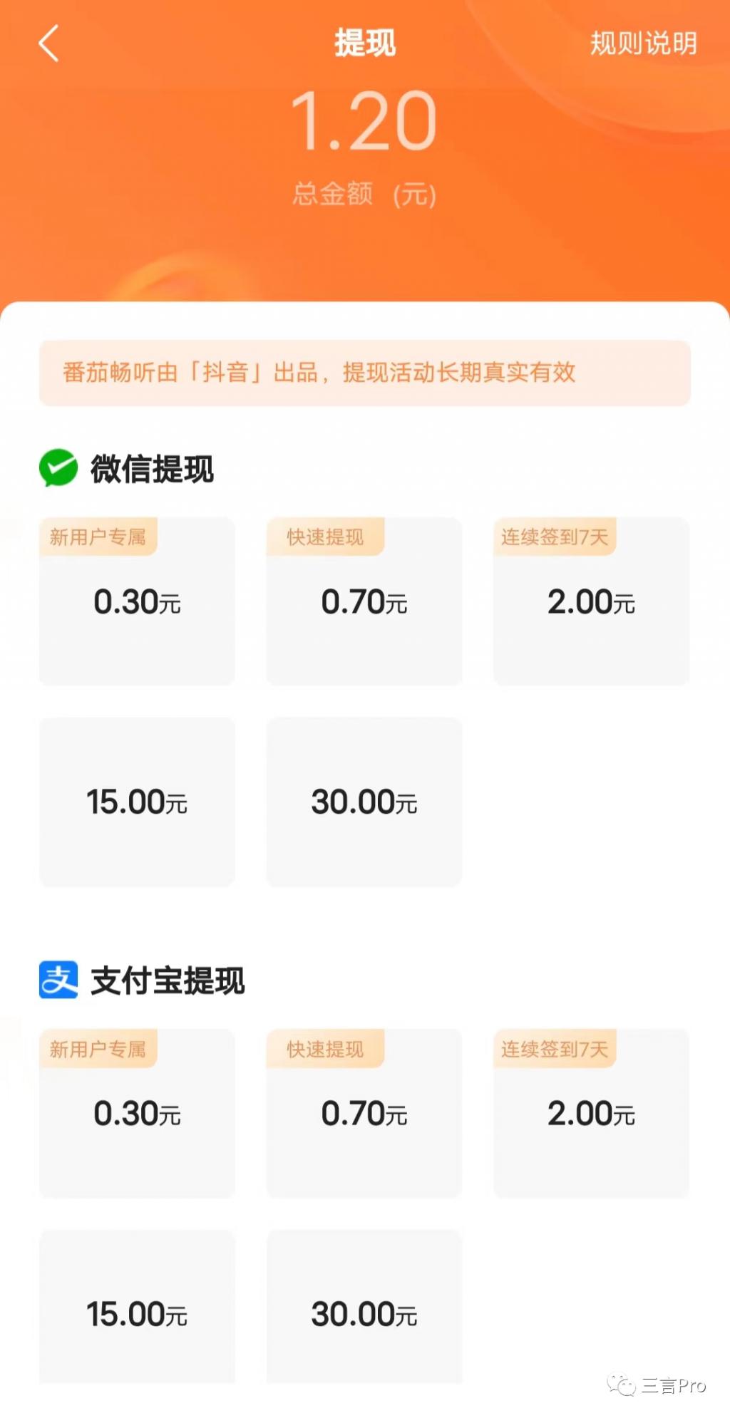 番茄畅听的提现方式包括微信提现和支付宝提现,提现金额均为 0.3 元、0.7 元、2 元、15 元、30 元。其中,0.3 元为 " 新用户专属 ",0.7 元为 " 快速提现 ",2 元需 " 连续签到 7 天 "。