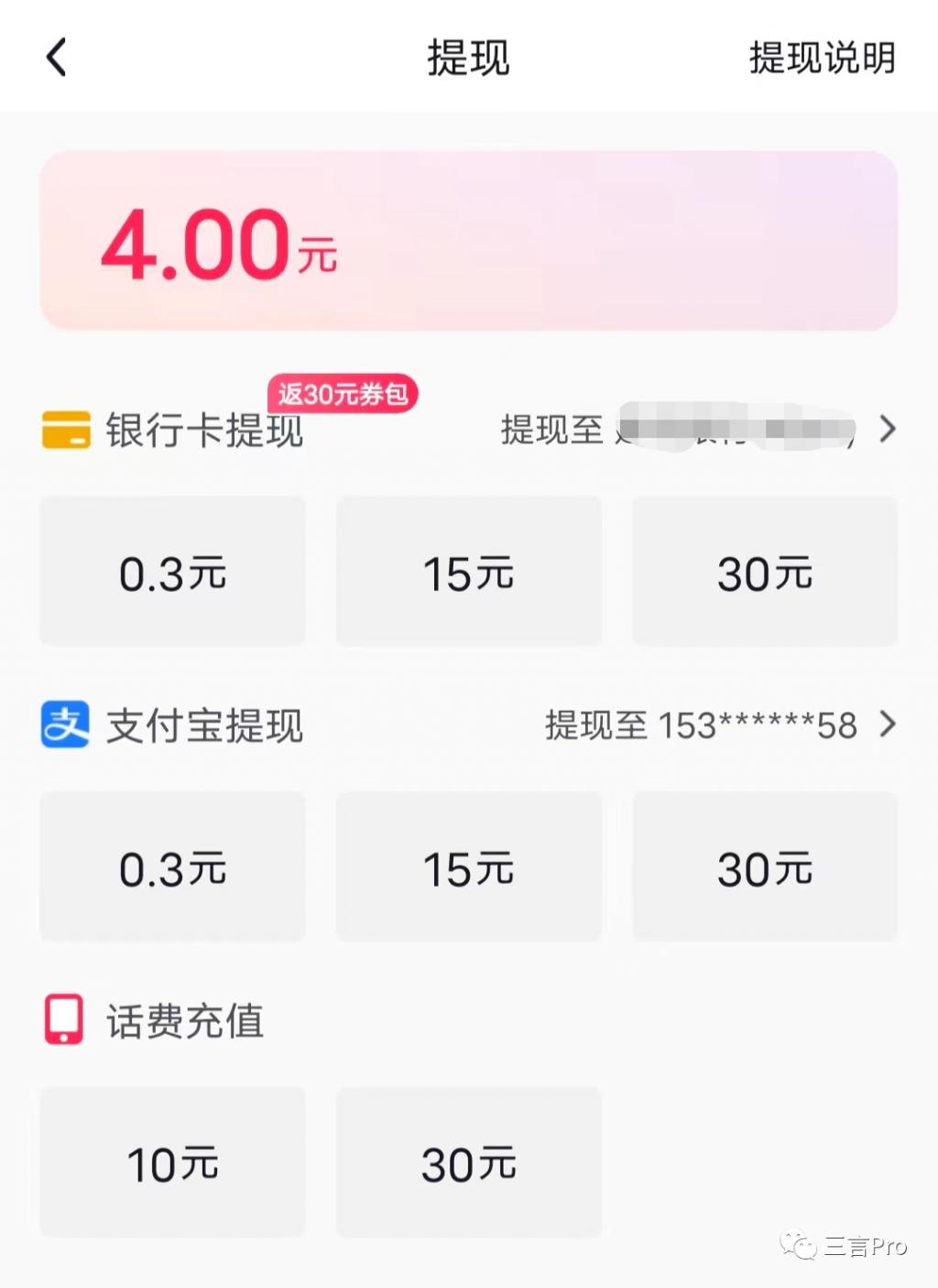至于提现,抖音极速版可以提现到银行卡或支付宝,金额为 0.3 元、15 元、30 元。也可以选择充话费,金额为 10 元和 30 元。
