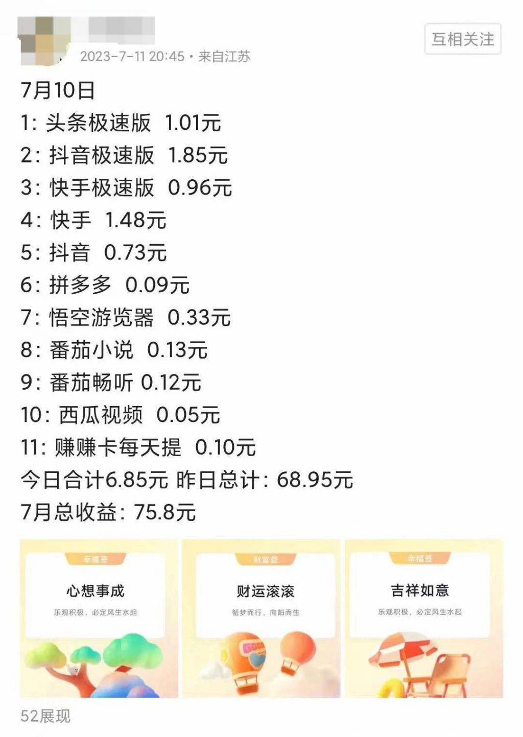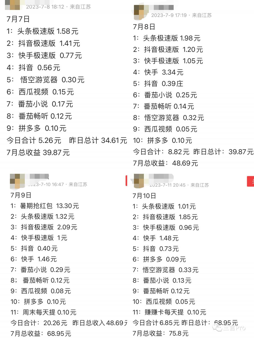 一位 IP 属地显示为江苏的网友发布的内容显示,她最近几天刷这些 APP 的收益为:7 月 7 日 5.26 元、7 月 8 日 8.82 元、7 月 9 日 20.26 元、7 月 10 日 6.85 元。