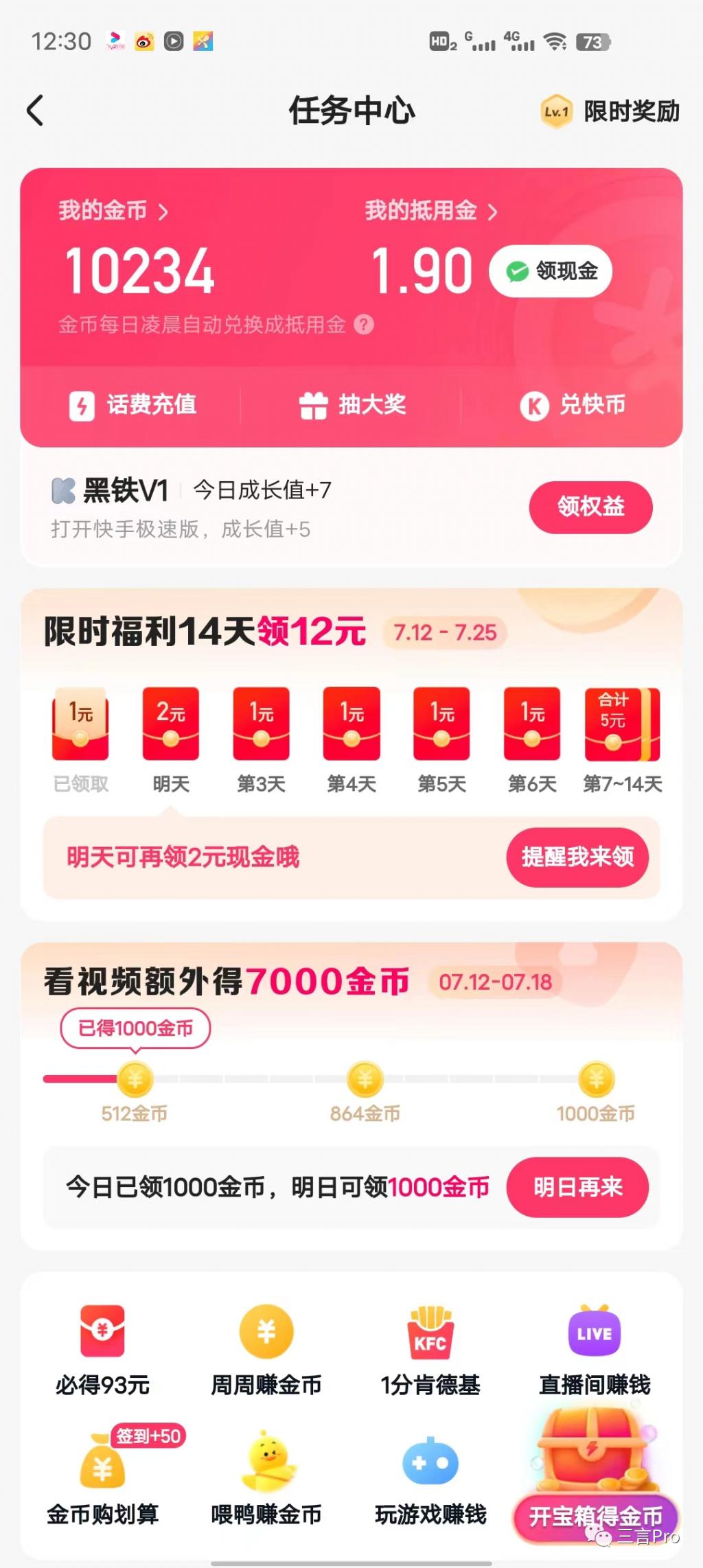 截至中午 12:30,笔者在快手极速版共获得 10234 金币,1.9 张抵用金(可兑换 1.9 元)。