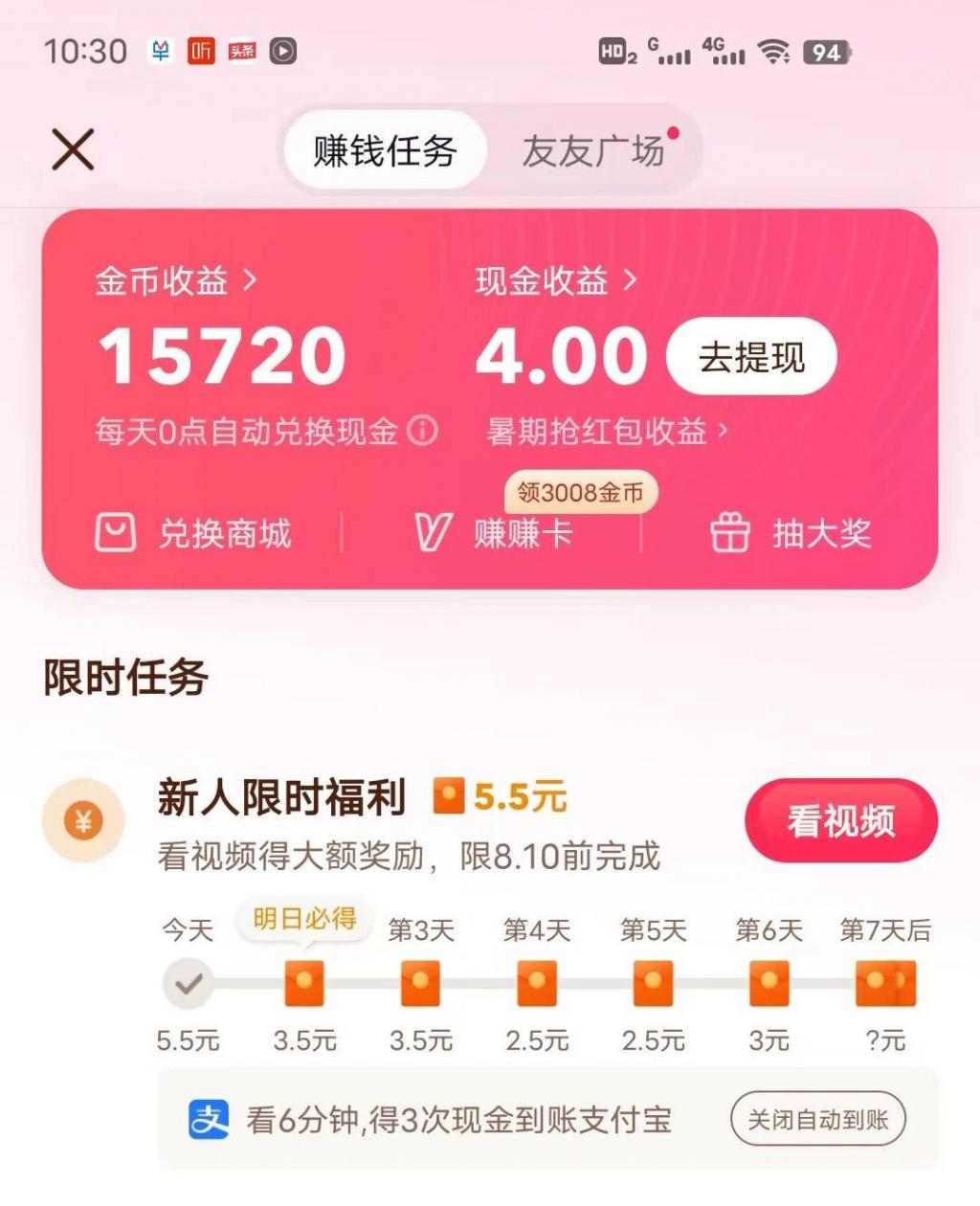 然后笔者就开始刷视频,中途还做了几个 " 赚钱任务 "。