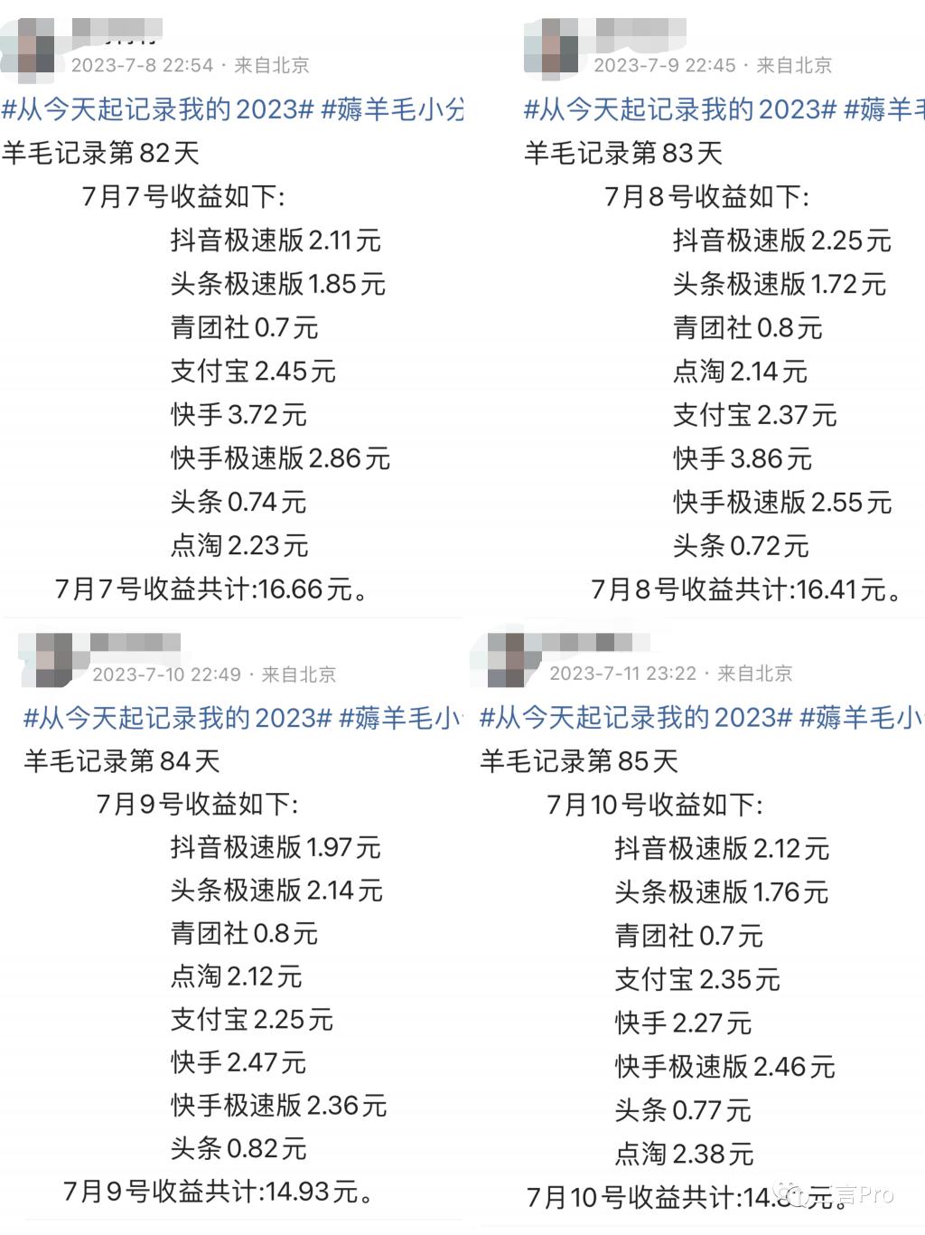一位 IP 属地显示为北京的网友发布的内容显示,他的收益为:7 月 7 日 16.66 元、7 月 8 日 16.41 元、7 月 9 日 14.93 元、7 月 10 日 14.81 元。