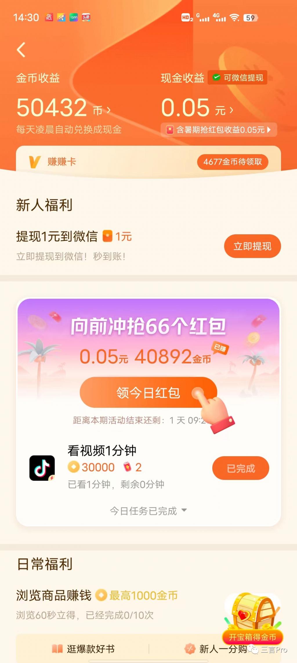 截至下午 14:30,笔者共获得 50432 金币,以及在 " 暑期抢红包 " 活动中获得的 0.05 元现金收益。