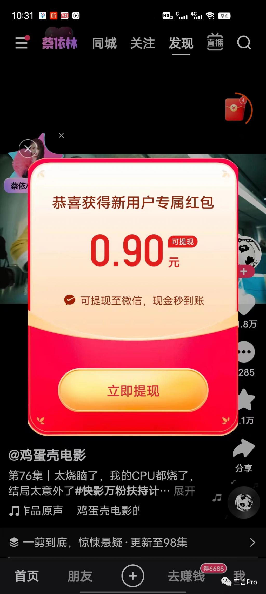 接着笔者又测试了快手极速版,同样有一份新用户专属红包,为 0.9 元。