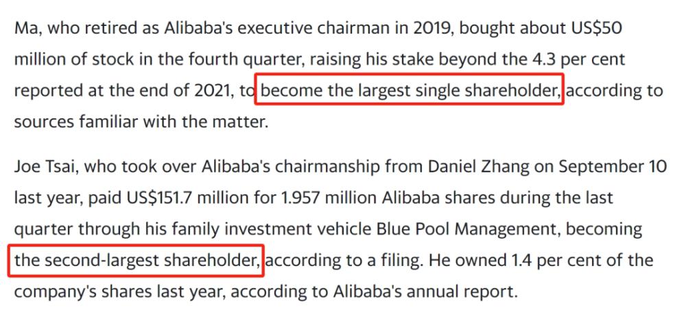 该报道还称,马云在此次增持 5000 万美元后,持股比例已经高于 2025 年底的 4.3%。这与前面提到的最后一次在财报中 4.8% 矛盾,而且理论上创始人持股比例每年都需要披露。蔡崇信此前在阿里 2025 年 7 月披露的年报中,持股比例为 1.4%。