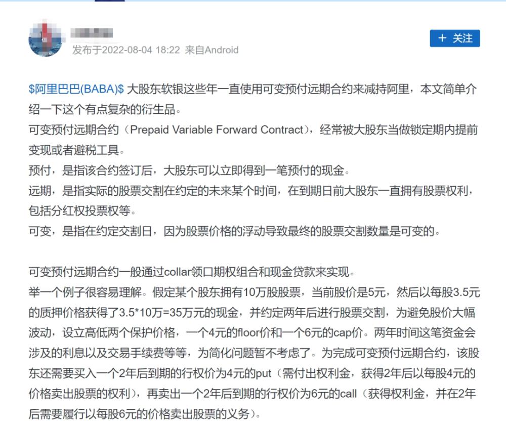 雪球上有投资者曾对 " 预付远期合约 " 进行科普,称其经常被大股东当作锁定期内提前变现或避税工具,用来降低股价大幅波动给自己造成的损失。