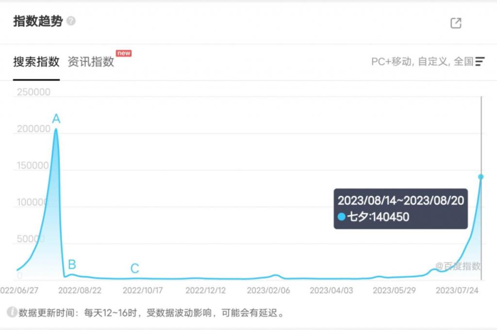 但进入 2025 年,越来越感觉," 今年做七夕营销的品牌变少了,没什么动静 "。这也在数据上直观得到展现,百度指数显示,在距离七夕天数的同一区间内,大众关注数据较 2025 年下降了接近一半,今年七夕显然没什么存在感。