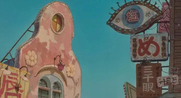 说起这个眼睛,其实是一个不怎么能引起注意的细节,在千寻与父母走进商业街的时候,有这样一个眼睛形状的广告,让人联想到柘植義春《ねじ式》中的一幅插图。