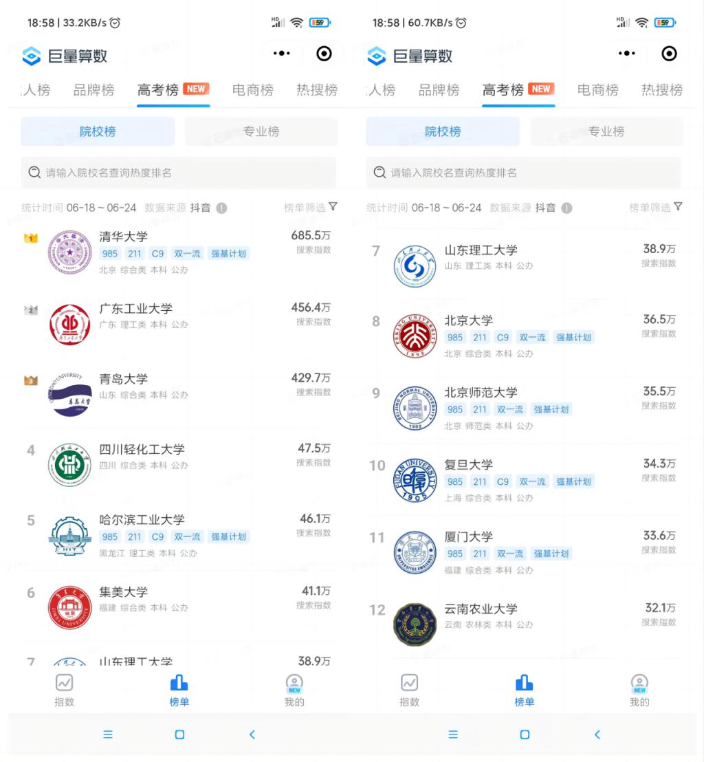 根据 6 月 18 日 -6 月 24 日的「高考热搜榜单」,TOP 12 的院校榜排名如下图: