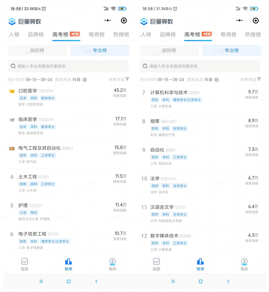 不仅是院校榜,巨量算数「高考热搜榜单 · 专业榜」带来的惊喜更多。