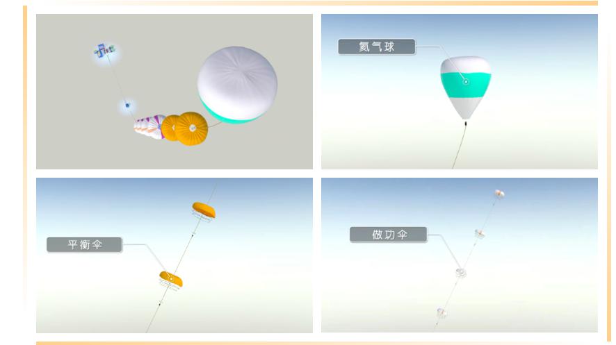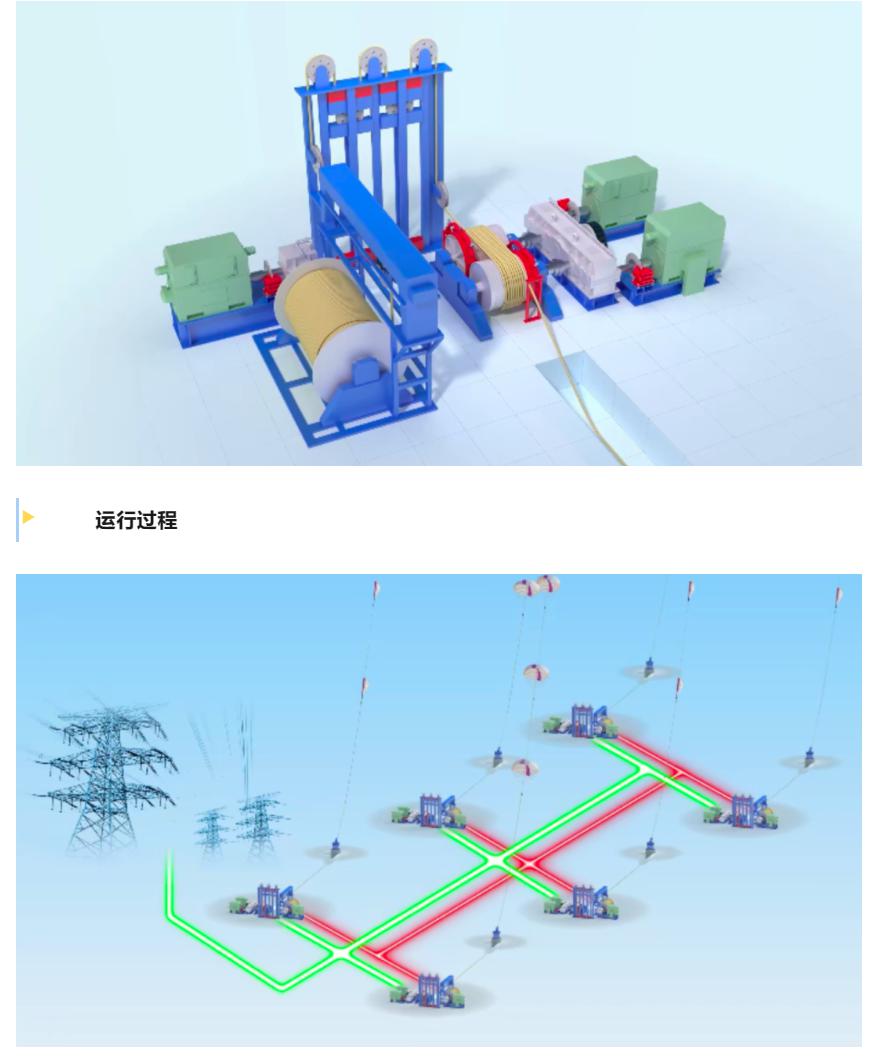 " 伞组 " 通过氦气球提供初始升力,上升到一定高度后打开做功伞,在 500 米以上高空采集捕获风能,对主缆绳产生巨大拉力,将风能转换成机械能,主缆绳同时拖动地面发电机组发电,将机械能转化为电能。