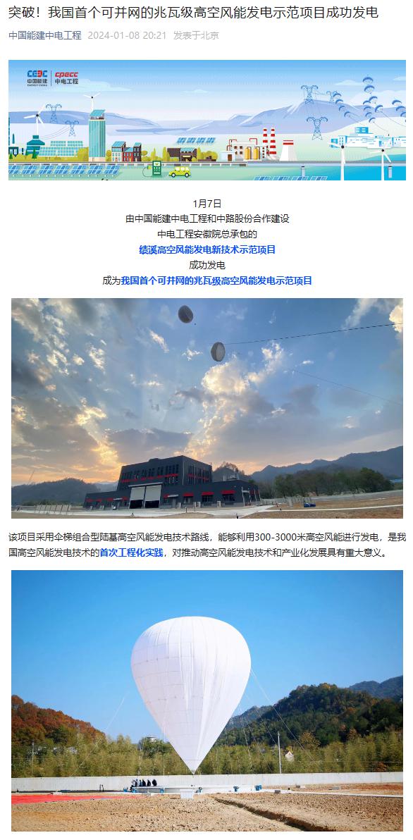 IT 之家 1 月 10 日消息,据中国电力工程顾问集团公司官方消息,1 月 7 日,由中国能建中电工程和中路股份合作建设、中电工程安徽院总承包的 " 绩溪高空风能发电新技术示范项目 " 成功发电,成为我国首个可并网的兆瓦级高空风能发电示范项目。