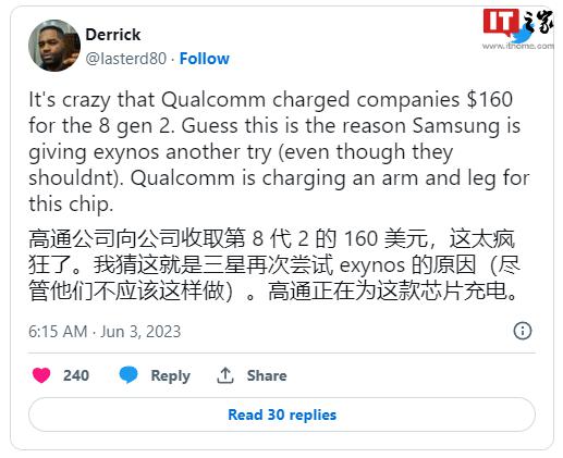 据推特用户 Derrick 透露,骁龙 8 Gen 2 的售价为每颗 160 美元(当前约 1134 元人民币),这比高通的客户愿意支付的价格要高出不少,因为这意味着旗舰智能手机的制造商必须提高他们的设备价格才能获得合理的利润。