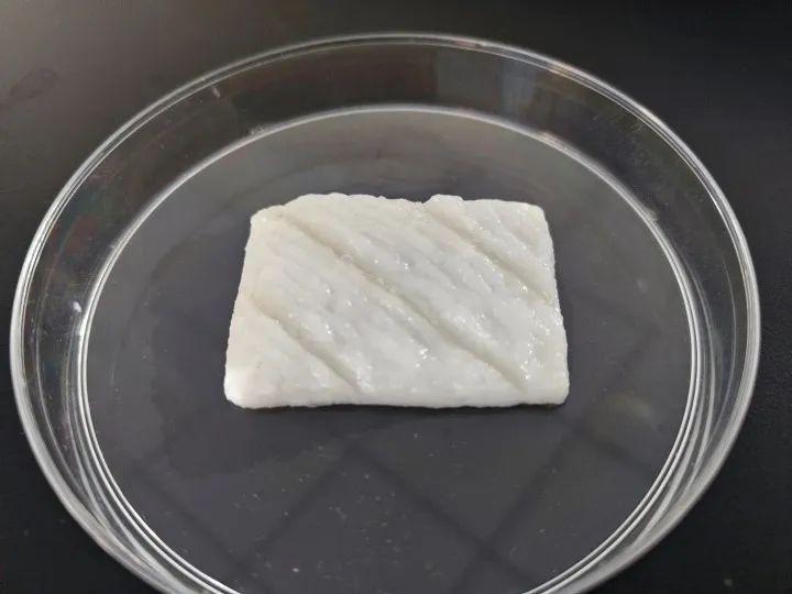 该项研究中,科研人员以大黄鱼为研究对象,分离出具有高传代能力的肌肉、脂肪干细胞,并通过调控两种信号通路诱导肌肉干细胞分化;基于可食用凝胶改造仿生建构鱼肌支架,产生类似自然鱼肉该有的结构和纹路,令肌肉细胞沿着 3D 打印的仿生结构有规则地生长,形成三维培养肌纤维束,实现组织状细胞培养鱼肉的制造。