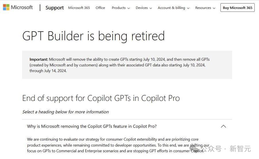 微软在其官网的支持网页上宣告 GPT Builder「退休」,这距离此项功能的发布仅仅过去了 3 个月的时间。