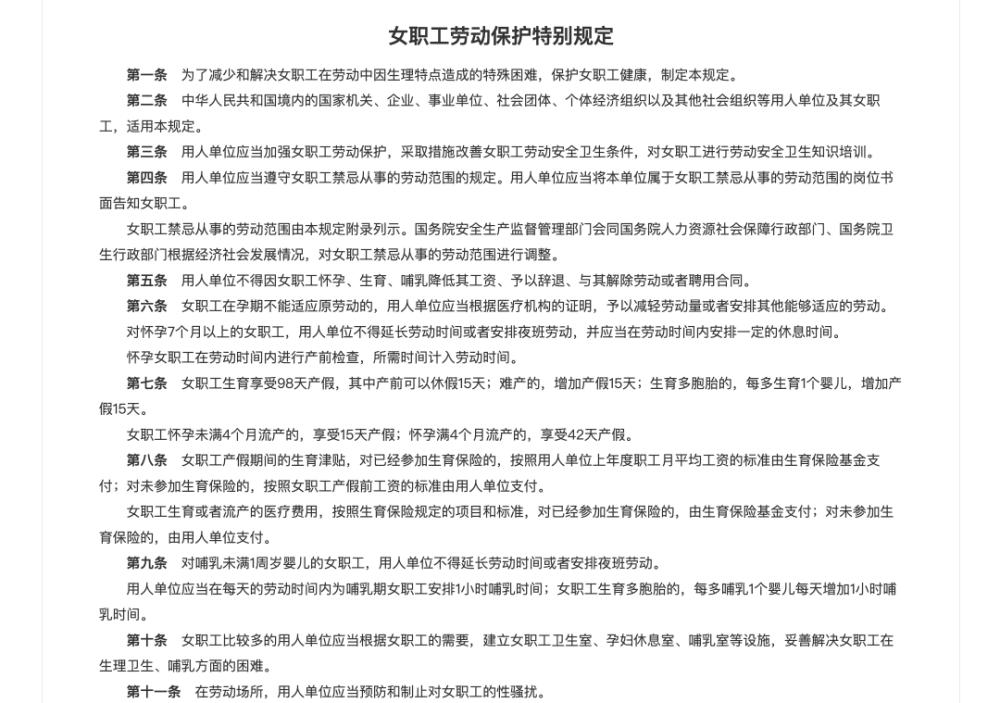▲国务院《女职工劳动保护特别规定》第五条规定," 用人单位不得因女职工怀孕、生育、哺乳降低其工资、予以辞退、与其解除劳动或者聘用合同。"(图源:中华人民共和国中央人民政府官网)