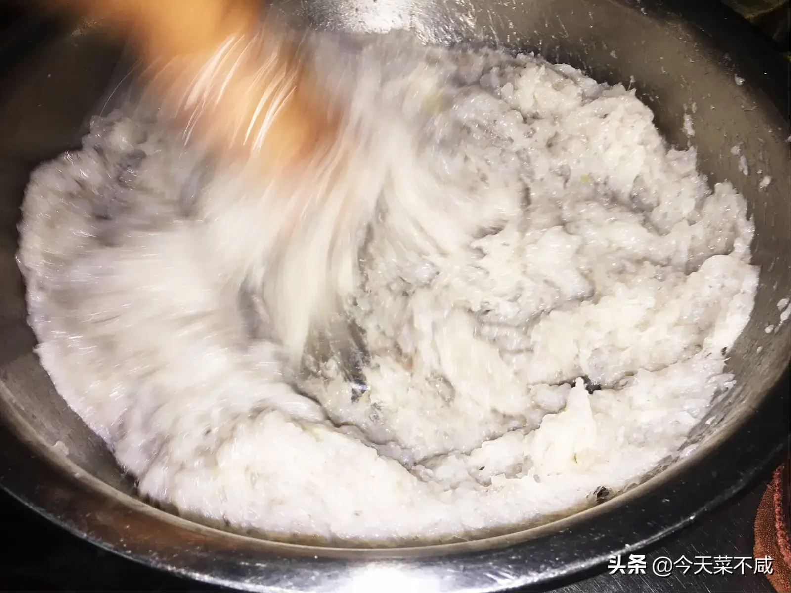 5、将虾泥放入盆里,顺时针方向搅拌均匀,搅打上劲儿。如果上劲儿不足可用力摔打,摔至虾起胶就可以了。