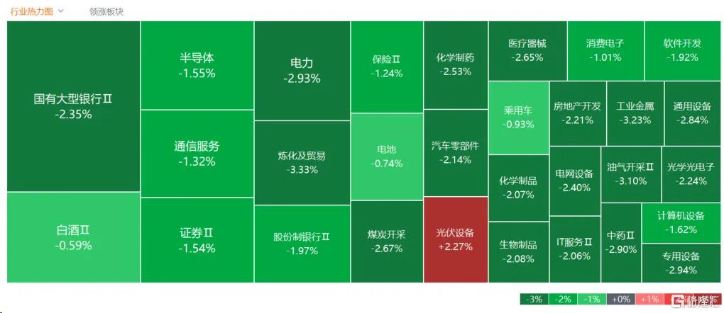 两市近 5000 股飘绿,盘面上,贵金属、油气、煤炭、电力、中药、医疗器械等概念全线下挫,冰雪旅游、乳业、中船系等大举回调,大金融股集体下跌,唯光伏股 " 万绿从中一点红 " 逆势上扬。